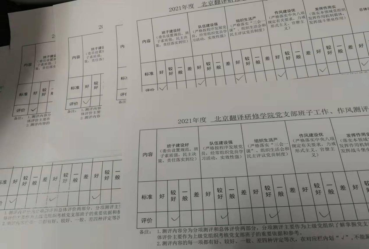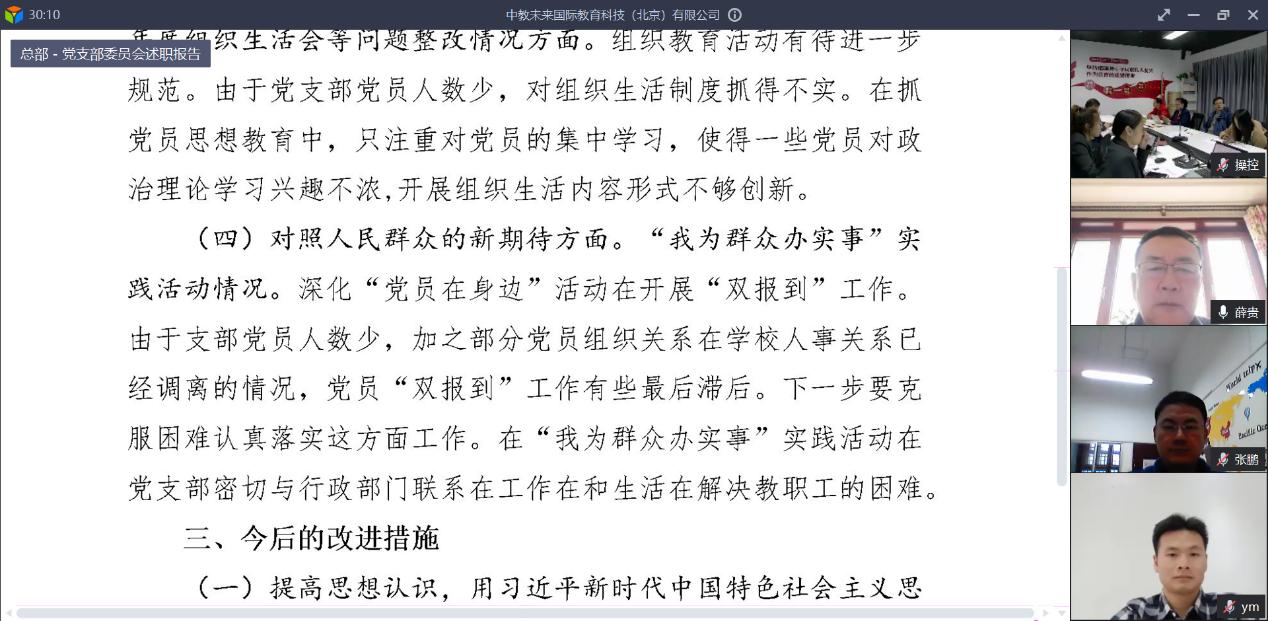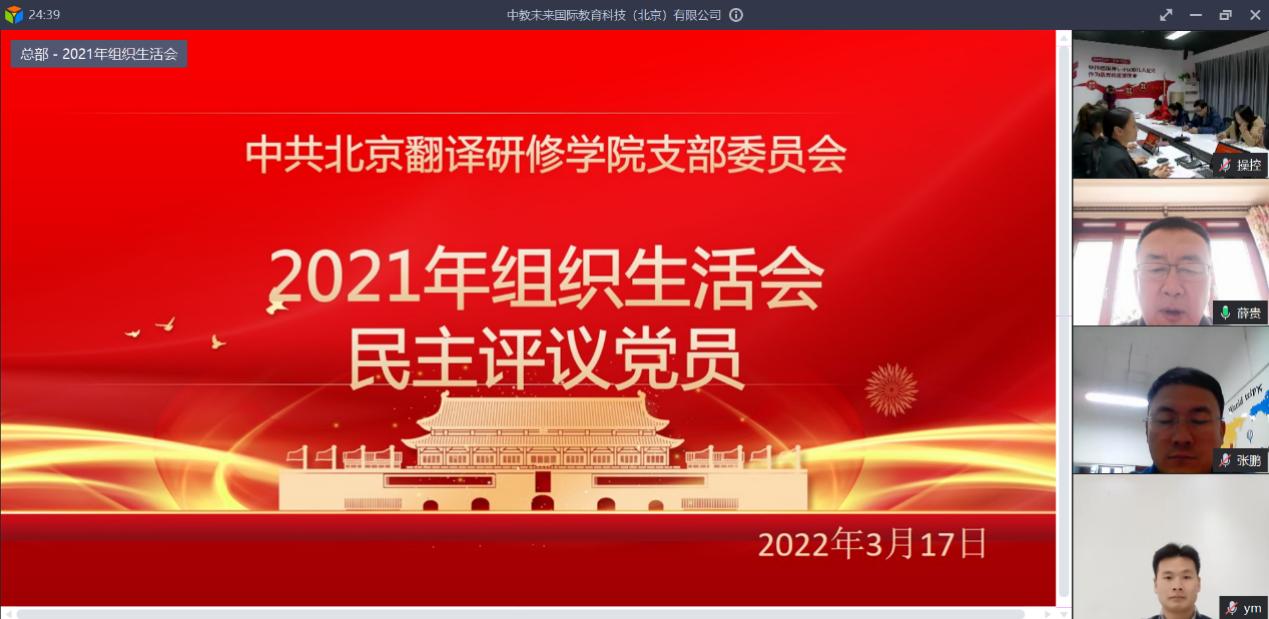 按照《中共北京市昌平区委组织部关于召开2021年度基层党组织组织生活会和开展民主评议党员的通知》要求,3月17日下午,北京翻译研修学院党支部在学院会议室采取线上线下相结合的方式,召开“弘扬建党精神,凝聚奋进力量”专题组织生活会和开展民主评议党员工作。会议由党支部副书记苑文婷同志主持,党支部全体党员参加会议。