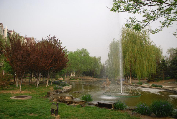 图二:我院教学楼前湖泊和喷泉(喷泉时而高,时而低,美丽的喷泉随着音乐的节奏,跳起了优美的舞蹈)