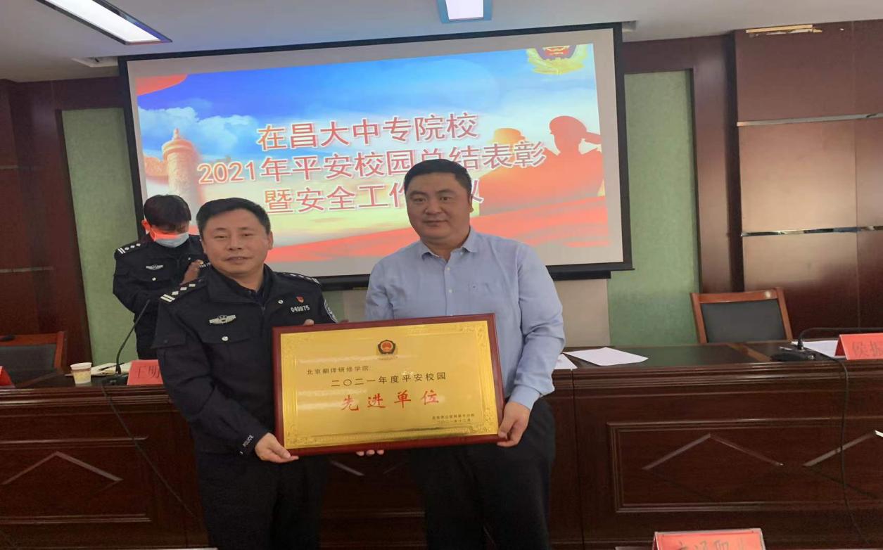 在2021年昌平区属大中院校安全工作评比中,我院继2020年之后,再次荣获北京市公安局昌平分局颁发的2021年度平安校园“先进单位”,保卫处处长张剑获得“平安校园安全先进个人”。